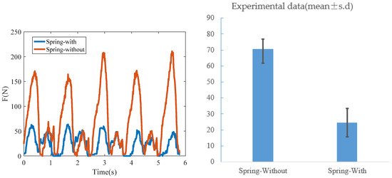 It can be seen from Figure 9 that the body–exoskeleton interaction force changed periodically, and its difference in amplitude value between the two states verified the effectiveness of the operation mechanism of the exoskeleton. When the spring of the exoskeleton ankle was locked, the average value of the body–exoskeleton interaction force was 24.63 N, and the peak value reached 63.54 N; when the spring of the exoskeleton ankle was in a relaxed state, the average value of the interaction force was 70.55 N, and the peak value reached 210.8 N. By comparison, when the spring of the exoskeleton ankle was locked, the average value of body–exoskeleton interaction force decreased by 65.1%, while its peak value decreased by 69.9% compared with no spring in the exoskeleton ankle.