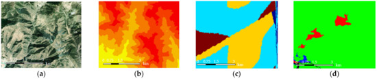 In this research, we selected a target area of about 40 km² within the range of 97.2°–97.3° E and 31.4°–31.5° N. After determining the target area, the satellite map and the DEM were downloaded on the geospatial data cloud website. In addition to elevation, the file contains a layer with different soil regions classified according to the National Earth System Science Data Center. Specifically, there are four soil types include sandy loam, clayey soil, lean clay and upland sandy. Also, land use data can be obtained using the method described above, and the data include water area, forest land, grass land and cultivated land. All the data are shown in Figure 2.