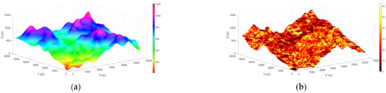 The reconstructed terrain map and slope map. (a) Terrain reconstruction with a resolution of 10 m using the ordinary Kriging method, (b) Slope map of 3D terrain.