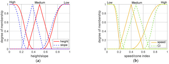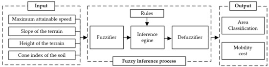 Block diagram of the proposed mobility quantification method. In this case, the maximum attainable speed of the UGV and multiple terrain factors (slope, height and soil) are taken as the input sets. In the fuzzy inference process, firstly, the fuzzifier converts the numerical value obtained from the input data into fuzzy sets. Which is, the input variables are represented in terms of their degree of membership for different membership functions. Secondly, the rules use “If–then” structure to relate the input sets to the output sets. Thirdly, the inference engine takes the input sets and decides which rules should be used from the rule base and creates the output sets. Finally, the defuzzifier takes the fuzzy output sets created by the inference engine and generates the output results (area classification and the mobility cost).