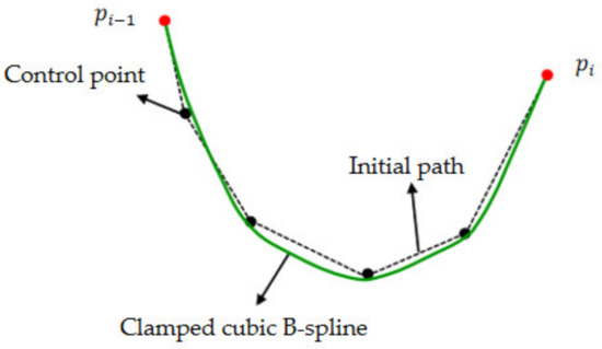 After the optimized path nodes are connected sequentially, the vehicle motion trajectory contains multi-segment polylines. Because the trajectory has hard inflection nodes, it cannot meet the requirements of vehicle kinematic constraints. In this paper, the clamped cubic B-spline smoothing method is used to optimize the trajectory of path planning; as shown in Figure 10, the black dotted line is the initial path from to , while the green curve is the result of smoothing.