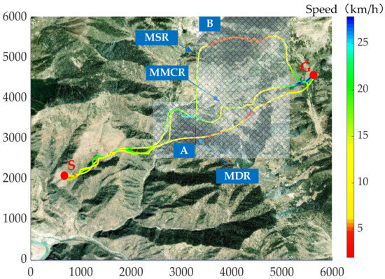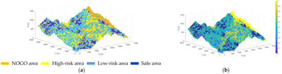 According to the results of the fuzzy process, the terrain is divided into NOGO area (), low-risk area (), high-risk area () and safe area (). All the areas are coupled into the total environmental area .
