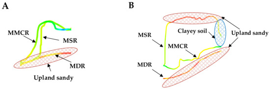 We project the soil type distribution data and land use data onto the corresponding 3D terrain model, respectively, and the results are shown in Figure A1. In this research, we define water areas and forest lands as NOGO areas. According to the comparison between VCI and CI calculated above, sandy loam is defined as a NOGO area. In particular, since the CI of lean clay is between VCI1 and VCI50, these areas are relatively difficult to traverse.