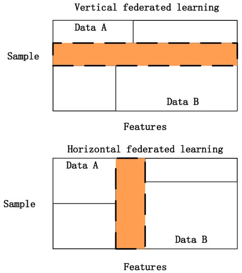 The federated learning is usually regarded as the decentralized machine learning. This is closely related to multi-party preserving machine learning [13]. The federated learning can be categorized into two types: namely, vertical federated learning and horizontal federated learning with the illustration of sample complementation and feature complementation, respectively, as shown in Figure 2. The federated transfer learning enables complementary knowledge to be shared and transferred across multiple federated domains and it can be used as the extension of the conventional transfer learning task [14,15]. Recently, in order to enhance the diversity of the transfer learning, some researchers have applied federated transfer learning for practical applications. Ju et al. [16] applied federated transfer learning on the EEG (electroencephalographic) signal classification of the brain–computer interface, proving the better domain adaptation ability of the proposed federated transfer learning framework. Wang et al. [17] proposed a software heterogeneous defect prediction method based on federated transfer learning. The proposed federated transfer learning framework not only solves the problem of insufficient labels but also builds models to match the different distribution of private data. Sharma et al. [18] proposed a novel federated transfer learning framework for the knowledge integration of the scattered datasets across different organizations. These researchers have shown the great potential of the federated transfer learning in the field of knowledge integration, as well as the knowledge complementation of the transfer learning.