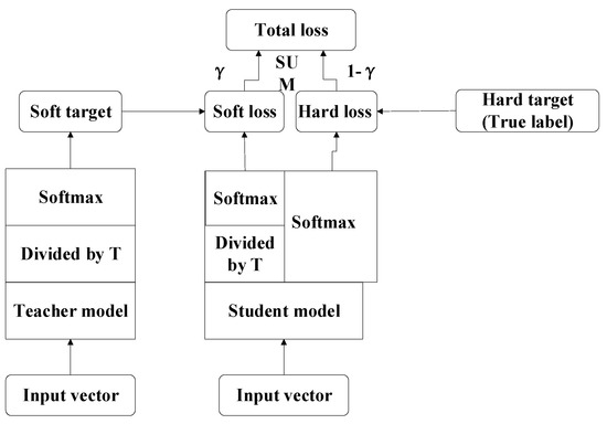 where the denotes the pre-softmax output vector of the teacher model; denotes the pre-softmax output vector of the student model. A relaxation parameter is introduced to soften the signal arising not only from the teacher output but also from the student output. The student network is trained by a group of softened teacher outputs with weight assignments as shown in Equation (9):