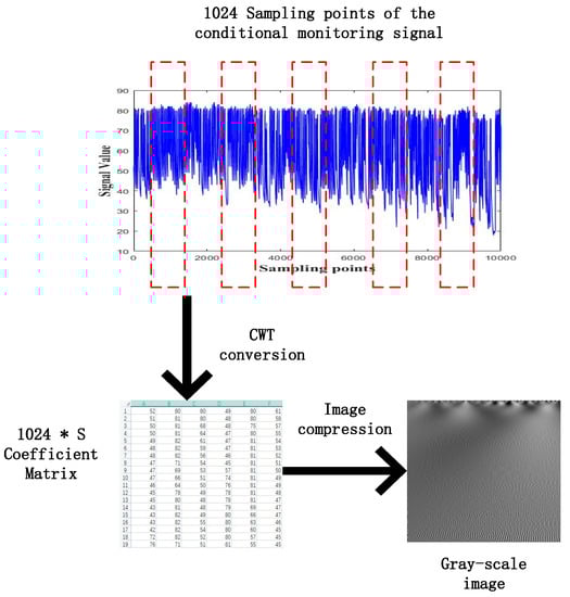 where the parameter “a” controls the shape of the Morlet wavelet and can be used for balancing the resolution between the time domain and the frequency domain. Since the Morlet wavelet transform can fully capture the signal characteristic and can achieve better resolution in both the time and frequency domain, the continuous Morlet Fourier transform is adopted in this paper for the conversion of the one-dimensional vibration signal to the two-dimensional time-frequency spectrum image. The specific process of the Morlet based “Signal to image” conversion is illustrated as shown in Figure 4. First, the window length is selected as 1024 according to the experiment of previous literature [27,28,29,30] where the 1024 continuous signal points are randomly selected each time from the raw signal. Second, the selected 1024 signal points are converted into a time-frequency spectrum by using the continuous Morlet wavelet transform which consists of coefficient matrices. The parameter “S” denotes the value of the scale factor ranging from 1 to S. Finally, the time-frequency spectrum is presented in the form of a gray-scale image.