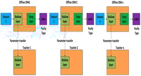 In this section, the proposed federated transfer learning framework is proposed for the establishment of multiple teacher models. As shown in Figure 5, several offline cumbersome CNN models are first pretrained on multiple datasets that are collected from multiple related areas. After the pretrained CNN models reach certain accuracy on their own datasets, the shallow layer of the offline CNN models are transferred to several standby teacher models containing different related knowledge.