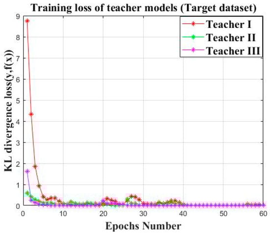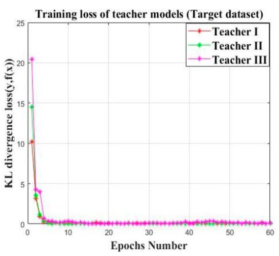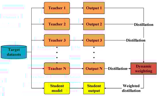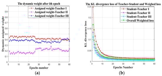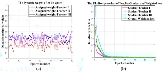 where denotes the KL divergence distance between the softened corresponding teacher output and the softened student output. Parameter j denotes the total number of the guided teachers and the dynamic assigned weight of the ith teacher is updated according to the KL divergence loss of the ith teacher model in the current epoch which has already been defined in Equation (6).
