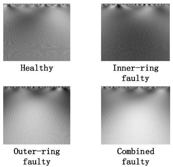 The one-dimensional time series current signal is transformed to the two-dimensional time-frequency spectrum through the continuous wavelet transform with the scale factor “S” of 200 which is set according to the data volumes [5]. The time-frequency spectrum is converted to the gray-scale image by using the bicubic interpolation. As shown in Figure 9, there is obvious distinguishable difference among these converted images of different health conditions, indicating the effectiveness of the data preprocessing method used in the literature [5] also being applicable in case study I of this paper.