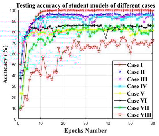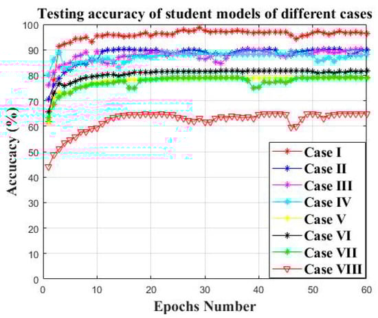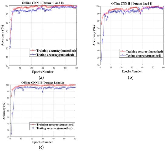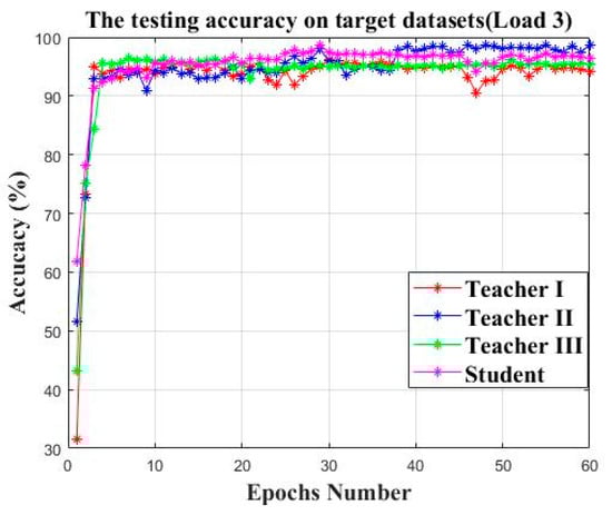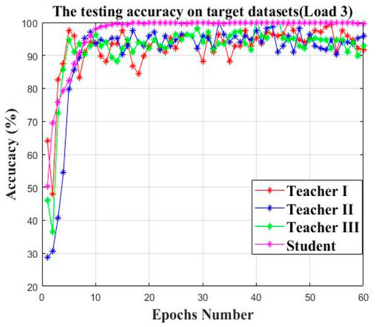 In this section, three cumbersome offline CNN models are pretrained on their source datasets collected under the load conditions of load 0–2, respectively. The configuration of the teacher model is illustrated as shown in Table 3. The blocks of B1–B3 are the convolution blocks with six layers in each and they are used for hierarchical feature learning, while the last block of B4 is the faulty prediction block with the Flatten and Soft-max layers. The established cumbersome CNN models are pretrained on their own datasets and the training accuracy curves are illustrated as shown in Figure 10a–c. All of the established offline CNN models can converge with limited epochs and reach above 95% on their own datasets in terms of training and testing accuracy.
