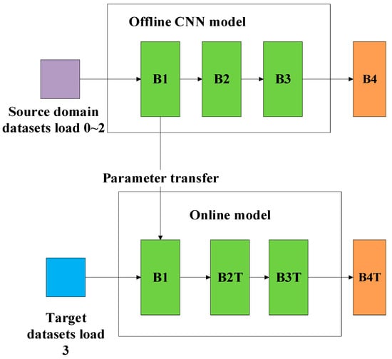 After the cumbersome private models finished offline training on their own datasets with the expected convergence accuracy, the shallow block “B1” of the offline CNN models is transferred to the online teacher models as shown in Figure 11, which is used for the following knowledge distillation. The established online teacher models are trained on the target training sets of Load 3 as illustrated in Figure 12. The KL divergence loss of the three established teachers are close to zero within the limited epochs, indicating the learning ability of the established teacher models on the target datasets.