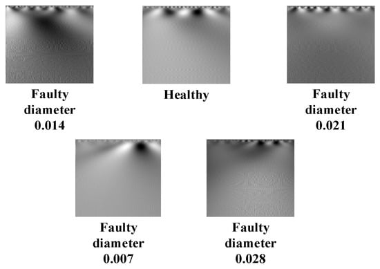 The one-dimensional current signal is transformed to the two-dimensional gray scale image through the continuous wavelet transform with the scale factor “S” of 200. As shown in Figure 16, there is also a distinguishable difference among the different conditional statuses of case study II. Since case study I is the prediction of the faulty type of different components while case study II is the prediction of the faulty severity of a certain component, the proposed approach proved to be applicable for the faulty prediction tasks of not only faulty type, but also of faulty intensity.