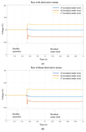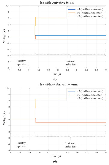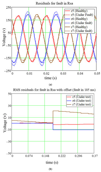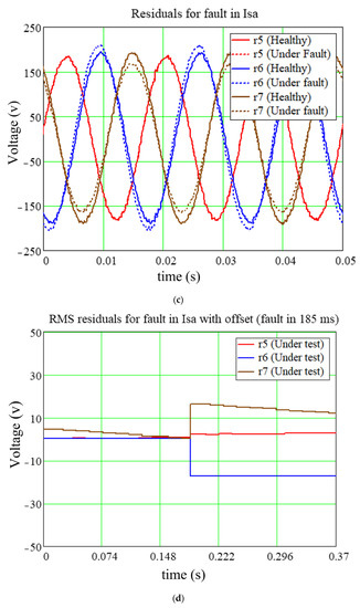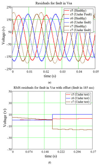 Simulation and experimental results of the residual set (r5, r6 and r7) with compensated RMS value in healthy and under-fault conditions are shown in Figure 5 and Figure 6, respectively. Figure 5a,b show the simulation residual transient in healthy and under-fault condition for , using the equations obtained in (41) and (42), respectively. Figure 6a,c,e show the residual signal before compensation RMS value, using the simplified Equation (42) in healthy and under-fault condition.