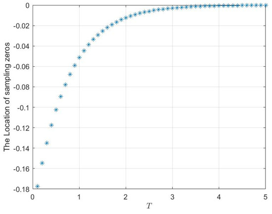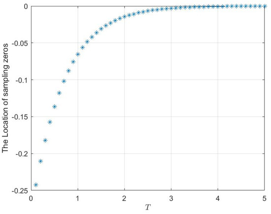 To discuss the properties of the sampling zero in different conditions, we also adopt the same strategy to research the approximate BTSH. Firstly, we select and the step wave . The values of sampling zero with respect to different sampling periods T are shown in Figure 4. Obviously, the sampling zero of the exact sampled-data model in the case of AFTSH can be also assigned in the unit circle for different sampling periods.