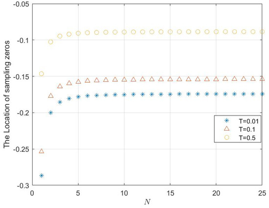 What is more, the location of the sampling zero of exact sampled-data model is also affected by the sampling period T, the variable f of FTSH and the number N of step waves. Here, Figure 5 shows the asymptotic behavior of the sampling zero with different step wave numbers when and sampling period is , or .