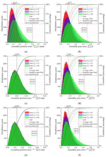 - If CP improves from 1.00 to 1.33, and then to 1.67, the decline rates of , ,, and range from 12.0% to 23.0%, while the decline rates of and are small. The last two assembly position errors are insensitive to changes in rotor shape and position errors, because they take a long-distance common line as reference. In general, the improvement in the rotor shape and position accuracy reduces most assembly errors to varying degrees;