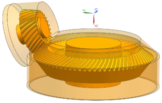 Due to the complex structure of the helicopter main reducer, in order to avoid the interference of other parts in the reducer, the windage loss of spiral bevel gear in the closed gearbox and the windage reduction mechanism of shroud are studied. In order to reduce the complexity of numerical simulation and improve the simulation efficiency, the gearbox structure is subjected to a simplification (ignoring web plate hole, bearings, flange structure, fixings, etc.). The top-down parametric modeling method is adopted in UG. According to Litvin local synthesis method [30], several tooth surface coordinate points can be obtained from the tooth surface equation of the gear pairs, and then the tooth surface shape can be obtained by fitting these coordinate points, so as to establish the model of spiral bevel gear. The final three-dimensional model of the gearbox and the coordinate system is shown in Figure 1.