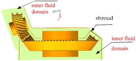 The shroud divides the fluid computing domain inside the gear box into two fluid domains, as shown in Figure 2. During the simulation, fluid can connect the two fluid domains through the meshing opening of the shroud and the gap between the shroud and the gear shaft for material and energy exchange.