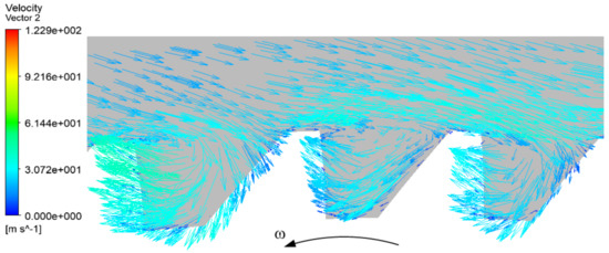 When the gear is rotating at high speed, the gear pushes and drags the fluid of the surface to form a strong air vortex. Figure 4 shows the velocity vector of the air flow field around the gear. It can be seen from Figure 4 that the flow direction of the fluid is opposite to the rotation direction of the gear.