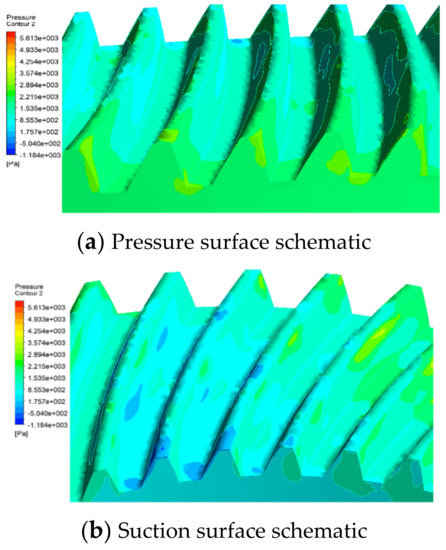 As can be seen from Figure 4, the gear drives the fluid around it to flow at a high speed. The fluid far from the tooth tip continues to flow in the original direction, while the fluid near the tooth tip is sucked into the gap between the teeth and forms a vortex in the tooth space. The vortex moves in reverse in the tooth space and collides with one side tooth profile, resulting in different pressure distribution on both sides of a tooth. One tooth surface is shown as pressure surface (as shown in Figure 5a), and the other tooth surface appears as suction surface (as shown in Figure 5b).