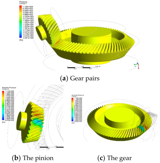 During the meshing movement of the gear pair, the maximum pressure appears on the teeth in the meshing area. Since the meshing zone of the spiral bevel gear is point meshing, a possible reason for this situation is that the air in the tooth space is squeezed while the tooth is gradually entering into the meshing area, resulting in a large pressure value here. The pressure on the surface of the gear teeth in the out-of-meshing area is small and negative. That is because the air around the teeth to be separated has been removed or squeezed out. The space between the gear teeth increases rapidly, resulting in a smaller pressure value here.
