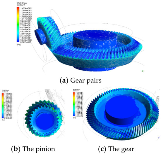 It can be seen from Table 2 that the pressure torque and viscous torque on the tooth surface work together, while only viscous torque is on the end face. The torque values of the heel and toe faces of the gear are one order of magnitude smaller than that of the tooth surface. Therefore, the tooth surface torque is the main source of the windage torque of the gear, accounting for more than 95% of the total windage loss.