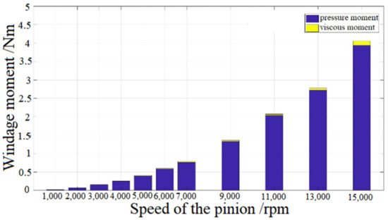 Comparing Figure 6 and Figure 7, it can be seen that the pressure of fluid on gear is 2~3 orders of magnitude higher than that of viscous force, whereby the gear windage loss is mainly caused by the pressure of fluid on gear, while the power consumed by viscous force accounts for only a small part. The windage torque of the gear in CFD post-processing module is extracted, and the variation trend of differential pressure moment and viscosity moment with the rotational speed are plotted on the same diagram, as shown in Figure 8.