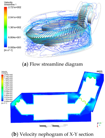 From the mechanical point of view, the power loss of the gear windage loss is caused by viscous force and differential pressure force. From the perspective of energetics, the energy loss of gear windage power is partially converted into thermal energy in the fluid and gear tooth surface, heel and toe surface and gearbox wall surface. The other part is dissipated into the turbulent movement of fluid in the gearbox. The flow field distribution in the gearbox is shown in Figure 9.