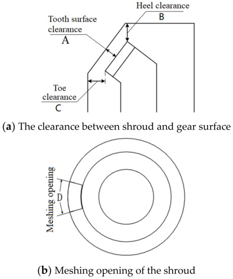 Therefore, it can be seen that the geometry structure of the shroud makes the spatial volume around the rotating gear smaller, the clearance between the shroud and a gear is smaller, the air flow between the teeth is lower, the turbulent kinetic energy of the fluid is lower, and the energy dissipation caused by the energy dissipation is lower, that is, the windage power loss of gear is the lowest. However, if the clearances between the shroud and the gear are too small, when the gear speed is very high, even if the stiffness of the shroud itself is very great, the gear will also absorb the shroud to the bottom of the gear. Consideration should be given to the influence of axial displacement caused by vibration during the gear rotation, errors in manufacturing and installation of shroud, deformation of shroud and the amount of lubricating oil required for gear cooling and lubrication. Combined with the actual working conditions, the stiffness of the support parts, the transmission power of the gear, the material properties and the existing manufacturing technology and according to practical experience, the minimum value is about 1 mm and the meshing opening is 30°. This is more in line with the engineering application than the references [4,16,18].
