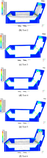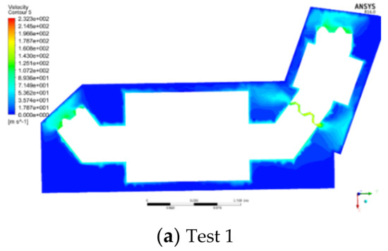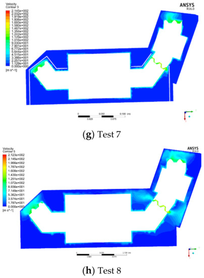 Eight groups of simulation analysis results of orthogonal test are taken as examples to study the windage reduction mechanism of the shroud. The fluid velocity field distribution inside the gearbox is shown in Figure 12.