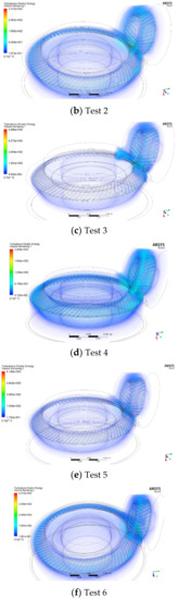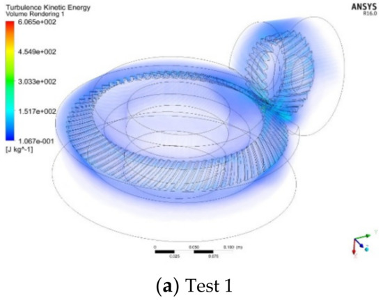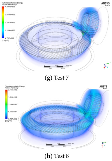 The turbulent kinetic energy represents the intensity of the turbulent motion inside the gear box. The turbulent dissipation rate represents the amount of the fluid kinetic energy lost due to the turbulent motion of the oil–air mixture. As shown in Table 7, the turbulent dissipation rate of the outer fluid domain is more than twice that of the inner fluid domain under the same test number. The turbulent kinetic energy of the outer fluid domain is much greater than that in the inner fluid domain. The turbulent motion of the outer flow domain is more intense than that of the inner fluid domain, but the fluid velocity in the inner fluid domain is higher, and it is the source of kinetic energy of the outer flow domain. Therefore, reducing the volume of the inner fluid domain means reducing the kinetic energy source of the fluid of the outer flow domain, so as to reduce the velocity of the fluid in the outer flow domain. In the simulation results of orthogonal testing, the turbulent flow energy distribution in the gearbox is shown in Figure 13.