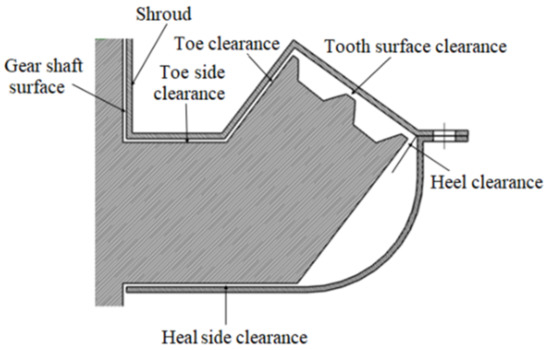 (1) Shroud should minimize the effect of axial and radial pumping fluid by gears, that is, minimize the distance between the shroud and gear profiles, so that the volume of fluid domain directly affected by gear rotation can be reduced. The specific measures that can be taken include reducing the tooth surface clearance, heel clearance and toe clearance. If the manufacturing process and installation conditions allow, the clearance between the shroud and the gear shaft surface, heel side and toe side can also be reduced. The significance of the clearance is in Figure 14, which shows a sectional view of a gear with shroud.