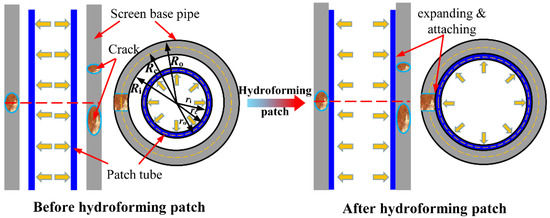 Hydroforming is widely used in automotive, aerospace, and other fields to realize the plastic deformation of parts through hydraulic pressure [24,25]. In this paper, on the basis of the requirements of a downhole screen pipe, we designed a hydroforming patch technology to repair a damaged screen pipe. As shown in Figure 1, the steps in hydroforming patch technology are as follows: