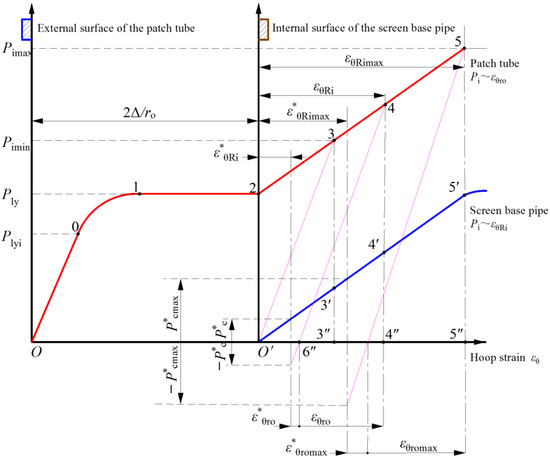 The initial state of the screen base pipe and patch tube is shown in Figure 2. The initial clearance is Δ. A hydroforming patch is shown in Figure 3. O–0–1–2–3–4–5 is the curve between the internal pressure and the hoop strain of the outer wall of the patch tube ; O’–3´–4´–5´ is the curve between the contact pressure and the hoop strain of the inner wall of the screen base pipe . The patch tube elastically deforms in section O–0. When pressure increased to point 0, the inner wall of the patch tube first began to yield and entered the elastic–plastic stage. When pressure increased to point 1, the outer wall of the patch tube yielded and entered the full-yield stage. When it reached point 2, the outer wall of the patch tube just touched the inner wall of the screen base pipe. The internal hydraulic force was then transmitted to the screen base pipe through contact pressure . Elastic deformation occurred in the screen base pipe, and the two tubes always fit together with the same strain position [33,34].