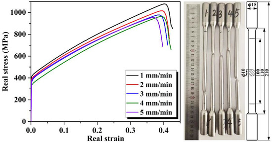 To study the effect of forming speed on the strength and plasticity of the patch tube materials, tensile rod specimens composed of AISI 321 according to the shape and size specified in the standard (ISO 6892-1: 2009 Metallic materials—tensile testing—Part 1: testing method at room temperature). Unidirectional tensile tests were carried out on an electronic universal material testing machine (WDW-100 manufactured by Shandong Luda Testing Equipment Manufacture Co., Ltd., Tai’an, China). Tensile speed levels were set as 1, 2, 3, 4, or 5 mm/min. The comparison of the true stress–strain curves at different tensile speeds is shown in Figure 5. At a lower tensile speed, AISI 321 was stronger and had higher plasticity. Therefore, lower speed should be used when forming a patch tube.
