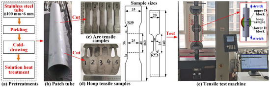 As Figure 6a shows, the patch tube was prepared by some pretreatments: A stainless steel tube with 100 mm outer diameter and 6 mm wall thickness was first acid-pickled to remove the oxide layer on the surface, and evenly cold-drawn with lubricant many times until its outer diameter was 140 mm. Second, the solution treatment of the tube was carried out in an RC-120-11 continuous bright heat treatment furnace (made by Dongguan Fengda Industrial Electric Furnace Factory, Dongguan, China) [37]. Under the protection of the mixture of hydrogen and nitrogen, the tube was heated to 1080 °C for 60 min. The solution treatment can overcome the work hardening of the material, an uneven microstructure, and hidden machining defects caused by cold drawing. According to the shape and size specified in the standard (ISO 8496: 2013 Metallic materials—tube—ring tensile test) and the literature [38], arc and hoop tensile samples were cut axially from the patch tube (Figure 6b), installed on the tensile test machine, and subjected to tensile tests at a speed of 1 mm/min, as shown in Figure 6c–e.