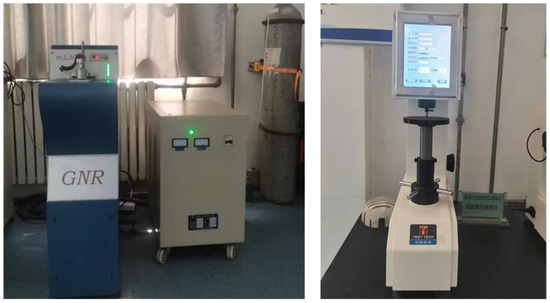 The material mechanical properties (yield strength, tensile strength, and elastic modulus) were calculated from the uniaxial tensile data for multiple groups of arc samples. The strain strength coefficient and material hardening exponent were determined according to a fitting formula. The elongation of the pipe was calculated with multiple groups of data from the hoop tensile test. Some sample blocks (20 × 20 mm) were cut from the patch tube, leveled, the oxide layer was polished and removed, and samples were used for measuring the composition and hardness of AISI 321. As shown in Figure 7, composition analysis was conducted with the use of a full-spectrum spark direct reading spectrometer (GNR-mL300), and hardness was measured with a Micro Vickers Hardness Tester (THV-30HT manufactured by Lab Testing Technology (Shanghai) Co., Ltd. Shanghai, China). Table 1 and Table 2 show the results of these calculations.