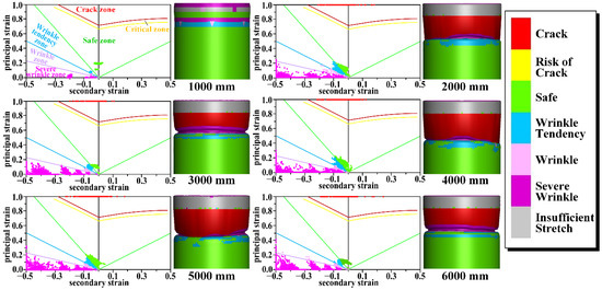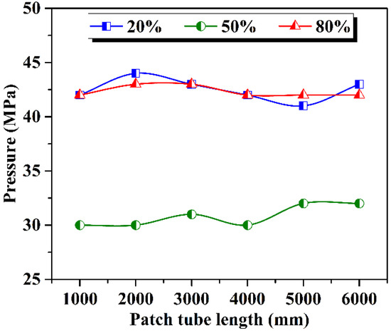 Because the length of a patch tube can affect pressure distribution in the tube and thereby forming performance, cases with different lengths (1000, 2000, 3000, 4000, 5000, and 6000 mm) were simulated, and results are shown in Figure 9 and Figure 10. In the simulations, forming limit diagrams (FLDs) were obtained. Forming limit diagrams are the curves of the strip region formed by the real limit strain ε1 (principal strain) and ε2 (secondary strain) of the patch tube under different strain paths. On this basis, the forming property of patch tube could be accurately and effectively estimated. The area above the red curve is the crack zone where the sample is cracked and scrap. The area between the red curve and yellow curves is the critical zone, which indicates that the sample tended to crack, and it was easy for the failed forming parts to appear in this zone. The area between the yellow and green curves is the safe zone, which indicates that the sample could be smoothly formed to meet the technological requirements. Areas below the green curve are wrinkle zones (including wrinkle tendency, wrinkles, and severe wrinkles). This wrinkle defect is an obstacle to successfully repairing damaged screen pipes with tube hydroforming. According to the forming limit diagrams in Figure 9, all patch tubes could be fully formed, and there were no defects in the patch section after forming, but there were some cracks and wrinkle defects at both ends of the tube. With the increase in length, the area of cracks and wrinkles continuously expanded because both ends were set to be fixed sections in the simulations, and the expansion forming of the patch section can generate axial tension that acts on both ends and results in instability and thinning in the transitional section. Pressure distributions at 20%, 50% and 80% length of each tube are shown in Figure 10. Pressures at both ends (20% and 80%) were higher, and values were close, and pressure in the middle (50%) was lower. Pressure at each position did not obviously change with the increase in tube length. Results demonstrate that AISI 321 had good hydroforming properties.