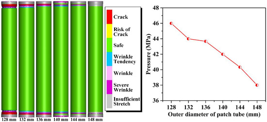 The initial outer diameter of patch tube was set to be 128, 132, 136, 140, 144, and 148 mm. Simulation results are shown in Figure 11. With the increase in initial outer diameter, the forming pressure gradually decreased from to 46 to 38 MPa, and wrinkles and cracks at both ends of the patch tube tended to decrease. Thus, in order to reduce wrinkles and crack defects, and decrease forming pressure, a larger initial outer diameter of patch tube should be chosen.