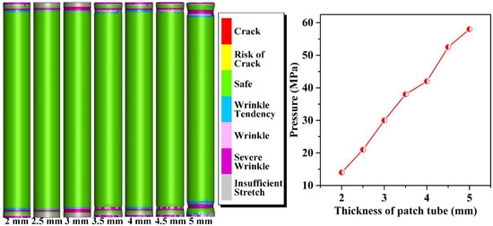 In the simulations of the effects of the patch tube thickness on forming performance, thickness was set to be 2, 2.5, 3, 3.5, 4, 4.5, and 5 mm. Calculation results are shown in Figure 12. With the increase in patch tube thickness, forming pressure grew in an almost straight line, which shows that was increasingly difficult to realize the hydroforming patch. When the thickness varied from 2 to 5 mm, forming pressure increased from 14 to 58 MPa. At 5 mm, a severe wrinkle occurred in two transitional sections of the patch tube. Thus, in order to ensure the quality of the hydroforming patch and reduce forming pressure, patch tube thickness should be properly chosen.