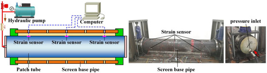 In order to test the forming performance, a hydroforming test bench was built. A screen base pipe with 177.8 mm outer diameter, and an AISI 321 patch tube with 140 mm outer diameter and 4 mm wall thickness were used, as shown in Figure 13. During the experiment, water was injected into the patch tube with a hydraulic pump. Four strain sensors were arranged around the inner walls at each cross-section (at 20%, 50%, and 80% of the axial length) of the screen base pipe. Thus, a total of 12 strain sensors were used to detect forming pressure on the patch tube.