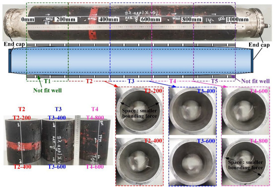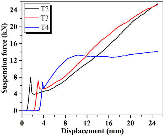 The measured suspension force is shown in Figure 16. The maximal suspension force for the T2 and T3 sections was about 25 kN, and about 14 kN for the T4 section, which met the requirements for a patch. The curves were mainly divided into static-to-dynamic conversion, growth, and steady stages. Within the displacement range of 0–25 mm, the T2 and T3 sections were still at the growth stage, and section T4 was at the steady stage. Suspension forces for the T2 and T3 sections were greater than that for T4, which indicates that the residual contact stresses for sections T2 and T3 were greater than that of T4, and that they were better-formed. During the experiment, the two ends of the patch tube were welded with the end caps, which caused the deformation of the two ends of the patch tube to be very small in the hydroforming process. However, the middle part of the patch tube fit closely with the screen base pipe, and its deformation was the largest. Thus, a certain conical degree in the outer diameter of patch tube was formed (that is, sections T1 and T5 of the patch tube did not fit well with both ends of the screen base pipe). Bonding strength at both ends was less than that in the middle; in section T4, the bounding force at the T4-800 side was smaller than that at the T4-600 side. In the experimental process, it was easier to separate the patch tube at the T4-800 side from the screen pipe, and its deformation is larger under the same pressure, while the displacement of T4-600 side remains unchanged. When the middle part of patch tube is prone to expansion and accumulation, which increases the friction force and causes a short and rapid rise in suspension force. After the separation of whole patch tube from the screen base pipe, the suspension force no longer rises, so overall suspension force was less than those for T2 and T3.