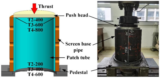 Installing a screen pipe is one of the main methods for developing a horizontal oil well [1,2,3]. With the long-term development of oil fields, especially with the use of acid pickling and multiple steam injection for mining in a heavy oil reservoir, the well can be affected by long-well section drainage, uneven stream absorption, and local high-speed erosion. Thus, the wall of a sand-control screen pipe can easily crack or break [4,5,6]. It can become perforated by corrosion or experience some other type of damage, all of which cause the screen pipe to become out of order, leading to the failure of sand control, which causes difficulties in plugging water, the production of a large amount of sand, and serious economic loss [7]. The treatment for sand-control failure mainly focuses on prevention, so developing methods for repairing a damaged screen pipe is urgent [8,9,10]. However, there is a lack of mature techniques and matching materials for the patch tube used for internally repairing a screen pipe damaged by breaks or corrosion perforation [11]. There are mainly two temporary repair methods: hanging a small-diameter sand screen on the pipe for sand control or installing a packer. Both methods have a short validity period and small internal diameter [12].