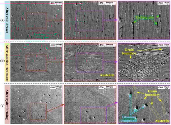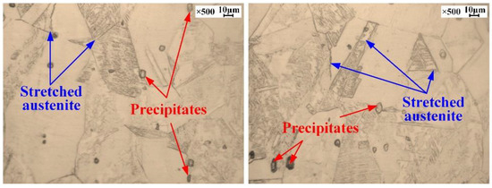 As shown in Figure 17c, the microstructure changed little after hydroforming and was still dominated by austenite. The grain boundaries were still evenly distributed and clear. However, Figure 18 shows that the austenite morphology had a tensile trend along the deformation direction, and the deformed martensite preferentially nucleated at grain boundaries.