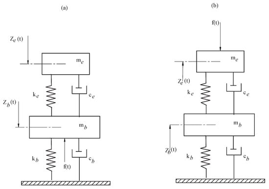 In Figure 1a, the mass-elastomer system can be modeled as a two-degrees-of-freedom system; then, FRF with the source of excitation under is developed with Equation (4). In Figure 1b, the mass-elastomer system can be modeled as a two-degrees-of-freedom system; then, FRF with the source of excitation on is developed with Equation (5).