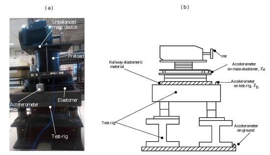 Generated force with an unbalanced mass device has usually been used for excitation at low frequencies [,] and the study of the dynamic behavior of structures [,]. The transmissibility response function has been estimated from experimental measurements by accelerometers placed on the base of the test rig, and the dynamic mass of the system is evaluated using shakers to ensure that the test rig is sufficiently excited [,,]. Moreover, estimation methods of the transmissibility matrix performed in the laboratory are based on the environmental excitations of the test rig, e.g., floor vibrations []. These methods have resulted in a reasonable estimate of the transmissibility matrix, provided that the vibrations generated by an excitation source provide sufficient spectral power in the direction of excitation of the system and considering the background noise to obtain an adequate signal-to-noise ratio [,]. Sine sweep base excitation vibration tests have been performed to certify structures of the aeronautical industry in a low-frequency environment, where dynamic behavior can be characterized by a small number of modes [,]. In addition, during the sine sweep, at each frequency, the response levels in all accelerometers were investigated; the load cells were different from a steady-state response []. The effects of the swept sine based on the sweep rate and a system of a single degree of freedom were examined [] determining that, with high sine-sweep rates, the steady-state response was not achieved. So, the result in this dynamic transmissibility case could be modified by the presence of transients [,]. For this, the non-dimensional sweep parameter that depends on the resonant frequency and the sweep rate were defined as other components for the analysis of the swept sine response []. The excitation with sine sweep using one unbalanced mass device has been another method with a sweep rate that concentrates the mechanical vibration energy in short-frequency ranges to ensure that, at these frequencies, the signal-to-noise ratio is large enough [,,]. The excitation parameters, such as the sine sweep rate, unbalanced mass, amplitude, and force have been used to generate harmonic excitation during experimental tests by means of an unbalanced mass device [,]. However, the combination of the excitation parameters of the unbalanced mass device that provides the vibrational excitation energy on the system, considering the background noise of the vibrations affecting the system, has not been determined. The problem of the experimental determination of the excitation parameters of an unbalanced mass device has not been specifically addressed. The spectral power required to generate sine sweep excitation close to the stable state on a railway system with the appropriate excitation parameters has not been determined. The criteria based on the sweep parameter and signal-to-noise ratio for the evaluation of the dynamic behavior of the components of railway systems have not been addressed.