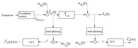 In the case of transmissibility, the measurement excitation signals of input and output are represented as and , depending on the position of the excitation source, as shown in Figure 2. One sine sweep harmonic signal for certain excitation parameters such as the sweep rate, amplitude, and excitation time is generated, in addition to test conditions such as background noise when the excitation source is turned on []. The vibrations of an unbalanced mass device or shaker device on the mechanical system are produced due to the sine sweep excitation signal []. For the signal processing, an overlap of 50%, standardized block size of N = 1024 points, and = 1000 Hz were applied. The aliasing effect during the acquisition of data in measurements and was reduced by applying low-pass filtering with . The sample of input and output signals were represented as and , respectively, with sampling time and n representing the number of data points of blocksize . Moreover, the signal register length T was split into M blocksizes of equal length, with [].