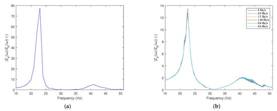 Peak–amplitude method using the electromagnetic shaker (Br&Kjaer, type: 4825): (a) the solid blue line represents for specific frequencies; (b) the magnitude plots of the estimated transmissibility of the system for different sweep rates, .