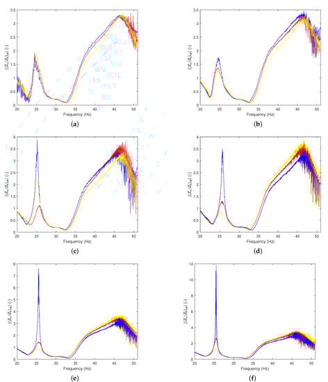 Transmissibility– obtained from the measurements and by an unbalanced mass device for 0.25 × 10 kgm (solid yellow line), 0.45 × 10 kgm (solid red line), and 0.65 × 10 kgm (solid line blue): (a) = 5 Hz/s, (b) = 2.5 Hz/s, (c) = 1.7 Hz/s, (d) = 1.25 Hz/s, (e) = 0.83 Hz/s, and (f) = 0.5 Hz/s.
