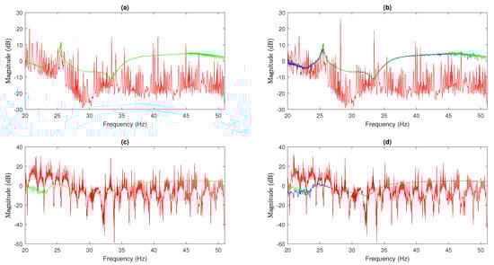 Estimated–FRF at different sine sweep rates and background noise added using the unbalanced mass me = 0.65 × 10 kgm. The solid red line, solid blue line, and solid green line represent the transmissibility obtained experimentally with background noise without signal processing, with signal processing, and without background noise with signal processing, respectively. (a) = 0.5 Hz/s with 30 dB SNR noise; (b) = 0.5 Hz/s with 0 dB SNR noise; (c) = 5 Hz/s with 30 dB SNR noise; and (d) = 5 Hz/s with 0 dB SNR noise.